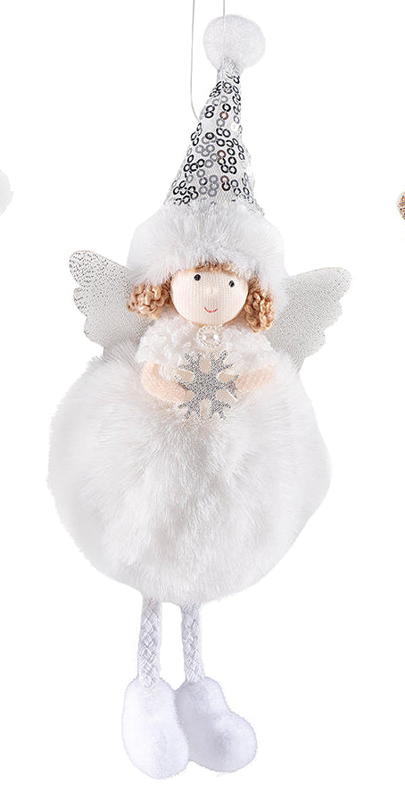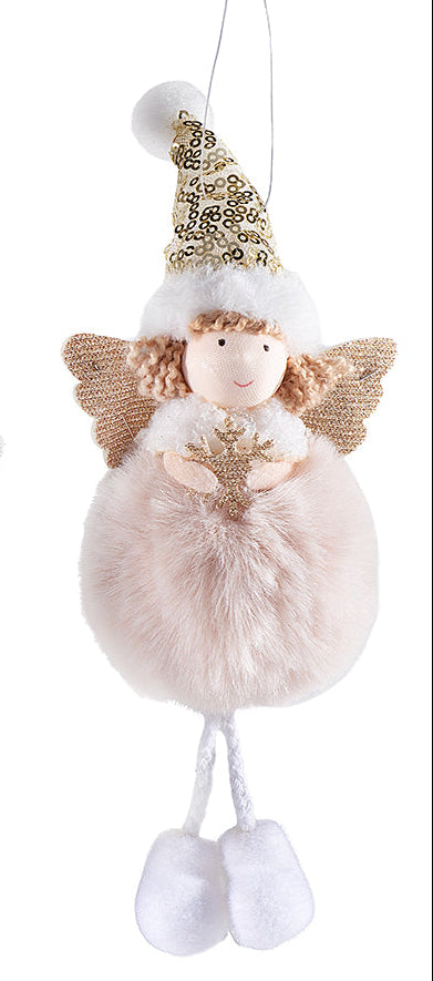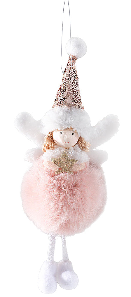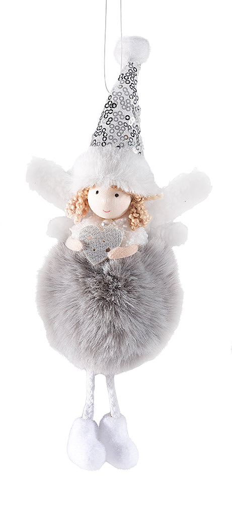 A plush pompom ornament with decorative sparkly hoods & glittered detailing